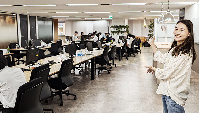 それでは執務エリアへご招待。フリーアドレスなので、皆さんチームでまとまったりしてお仕事をしています。